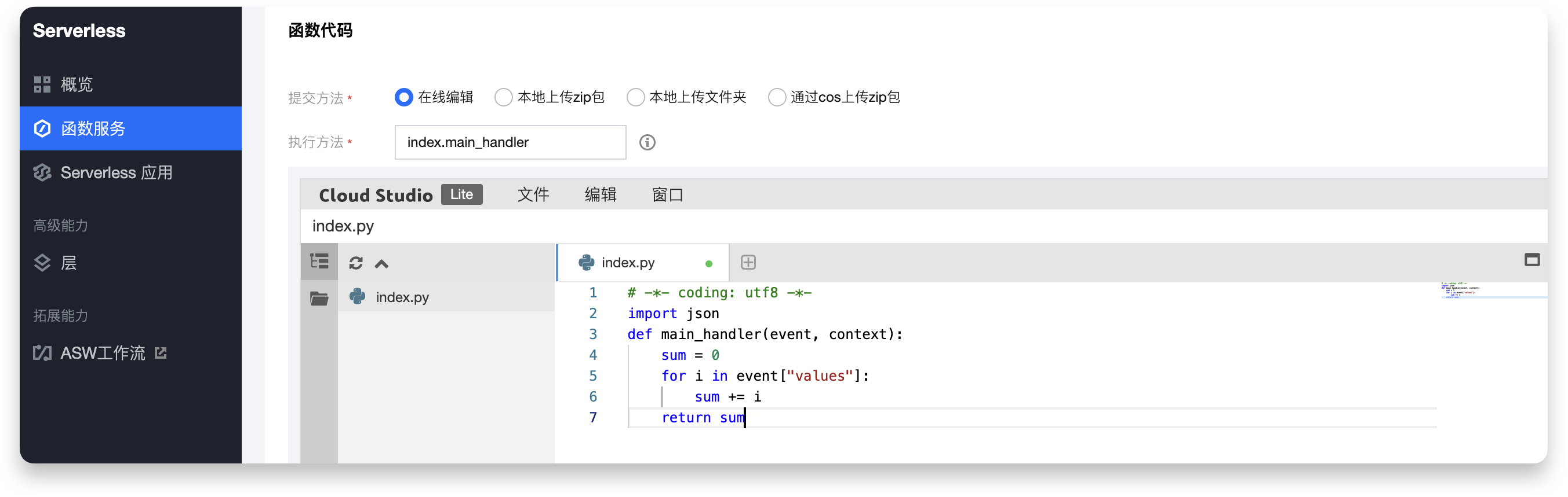登录云函数控制台,创建一个函数名称为 sum,运行环境为 Python 3.6 的云函数,点击进入 控制台地址