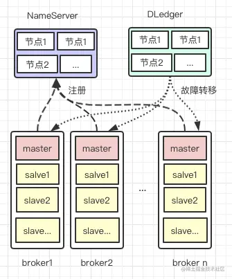 RocketMq 的高可用由 DLedger 提供,整个 broker 的高可用架构如下: