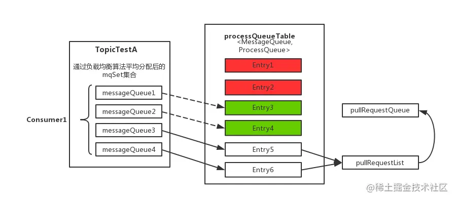 消息消费队列在同一消费组不同消费者之间的负载均衡,其核心设计理念是在一个消息消费队列在同一时间只允许被同一消费组内的一个消费者消费,一个消息消费者能同时消费多个消息队列。