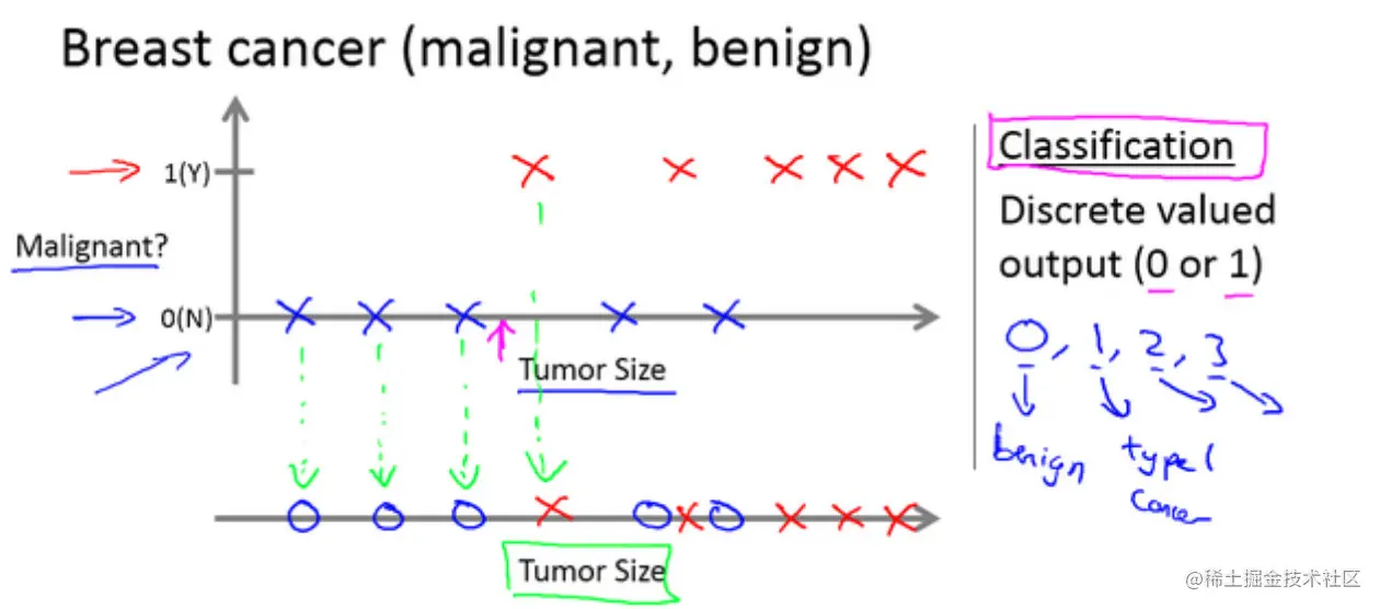 比如说可能有三种乳腺癌,所以希望预测离散输出0、1、2、3。0 代表良性,1 表示第1类乳腺癌,2表示第2类癌症,3表示第3类,也是分类问题。