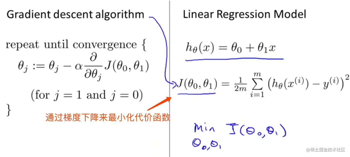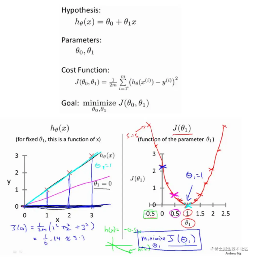 本例中是通过假设来进行,假设函数是关于x的函数,代价函数是关于的函数,使得代价函数最小化