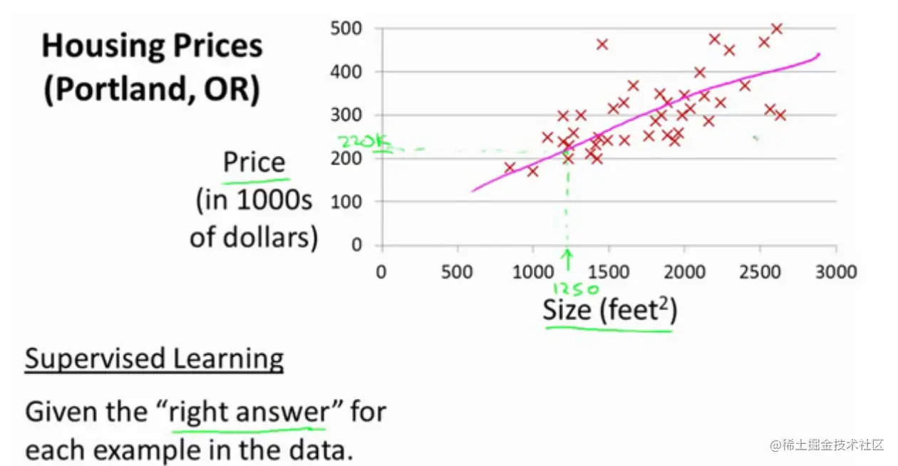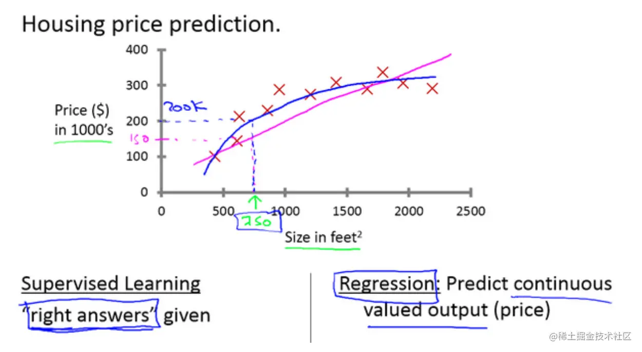 在监督学习中,我们给学习算法一个数据集,比如一系列房子的数据,给定数据集中每个样本的正确价格,即它们实际的售价然后运用学习算法,算出更多的答案,我们需要估算一个连续值的结果,这属于回归问题