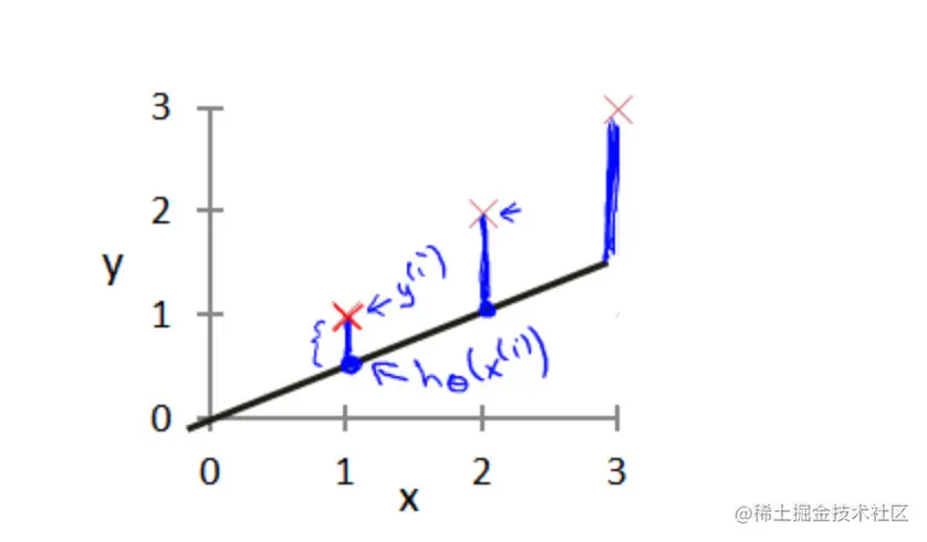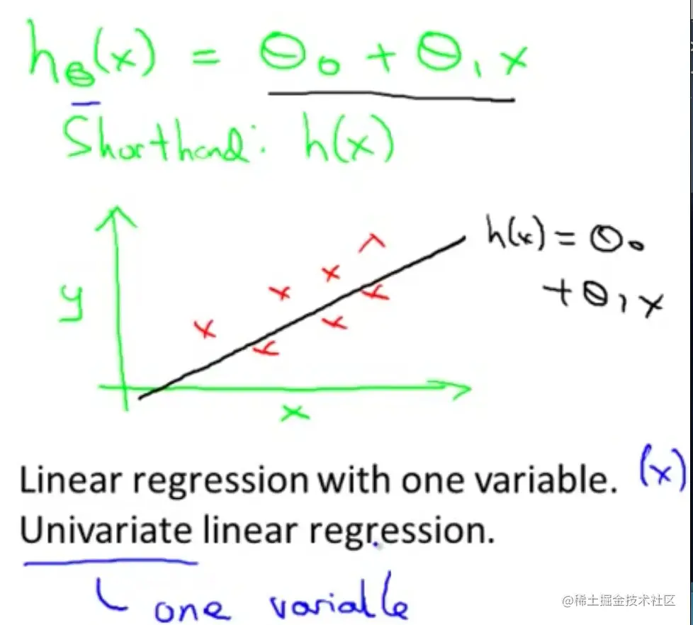 h表示hypothesis,代表的是学习算法的解决方案或者函数。h根据输入的x值得到y值,因此h是x到的y的一个函数映射- 可能的表达式:,只有一个特征或者出入变量,称为单变量线性回归问题