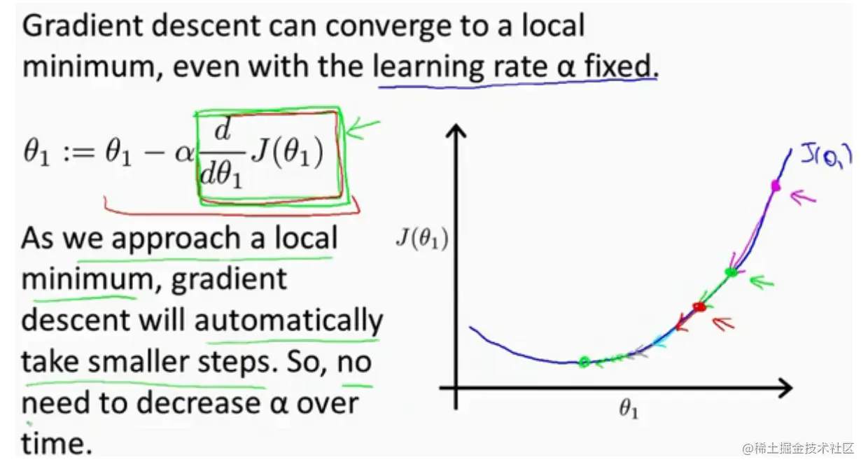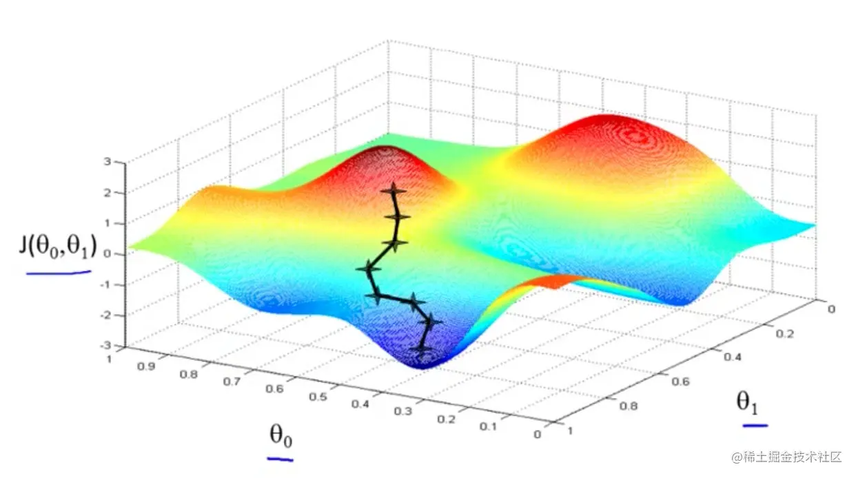 持续这么做,直到一个局部最小值(local minimum),因为并没有尝试完所有的参数组合,所以不能确定得到的局部最小值是否是全局最小值(global minimum)