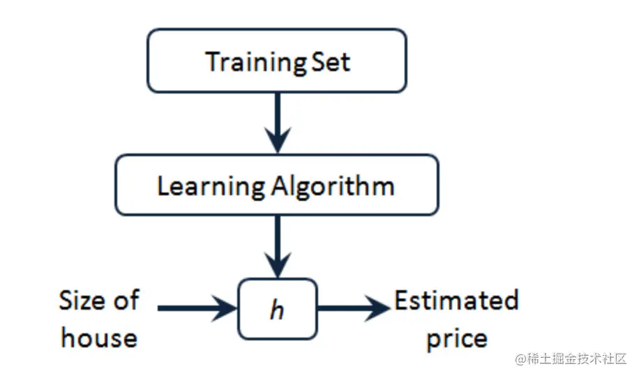 - 学习算法工作,输出一个函数,用h表示
