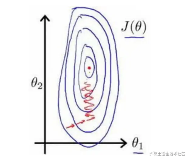 绘制代价函数的等高线图能,看出图像会显得很扁,梯度下降算法需要非常多次的迭代才能收敛。