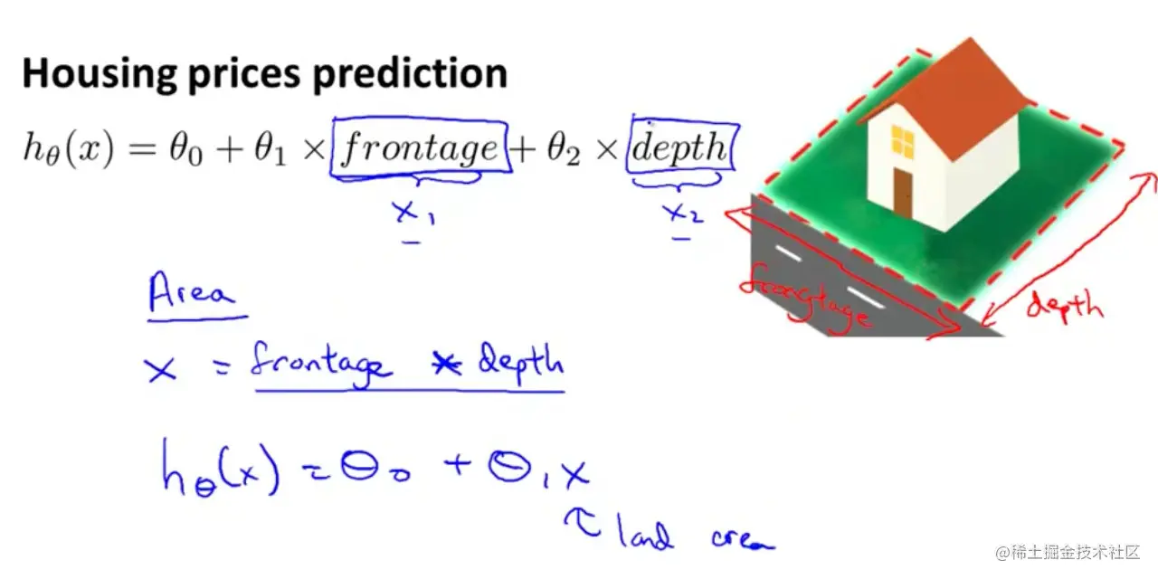 如房价预测问题, hθ(x)=θ0+θ1⋅宽度+θ2⋅深度 同时房屋面积=宽度 * 深度
