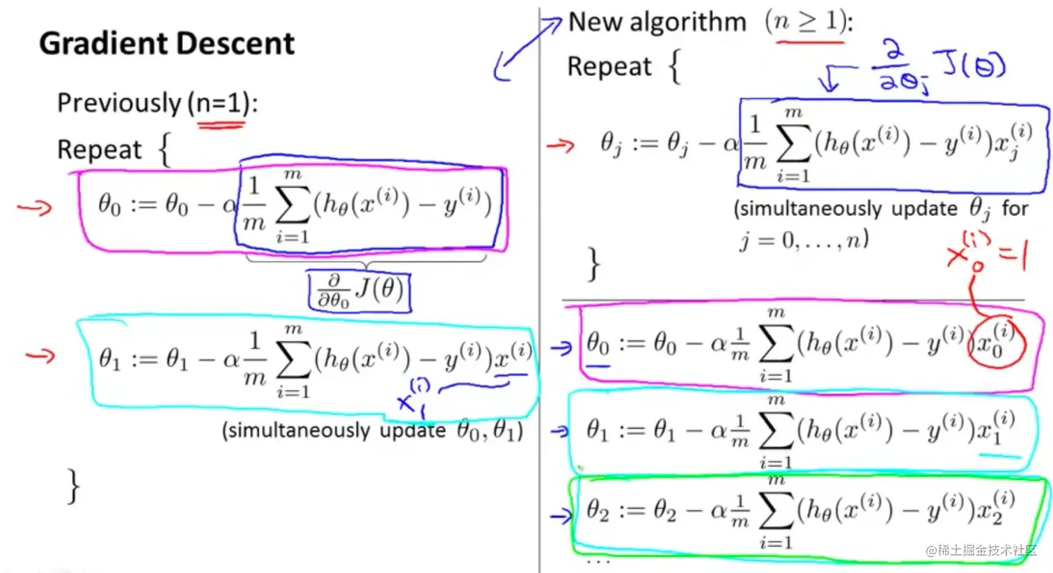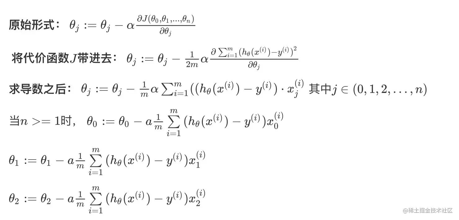 原始形式: θj:=θj−α∂θj∂J(θ0,θ1,...,θn)