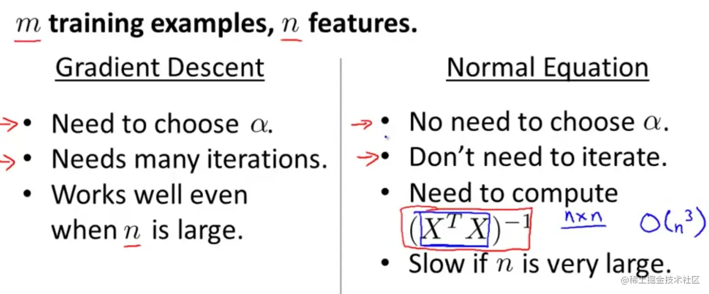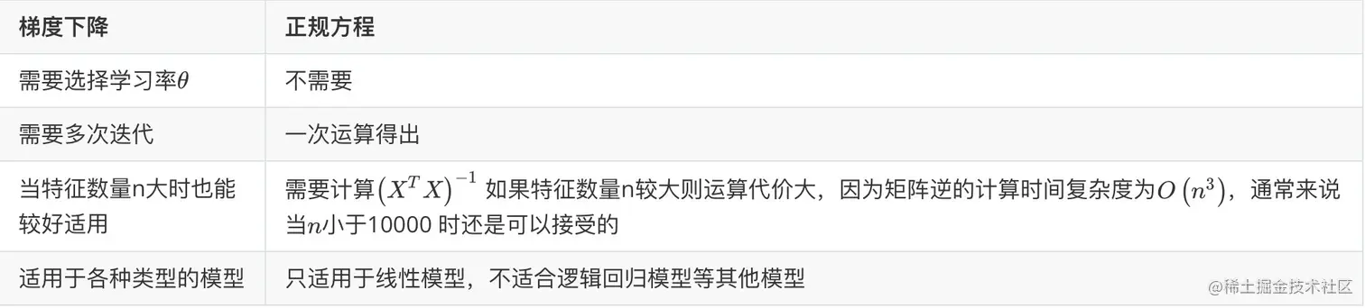 | 当特征数量n大时也能较好适用 | 需要计算(XTX) 的逆矩阵。如果特征数量n较大则运算代价大,因为矩阵逆的计算时间复杂度为O(n3),通常来说当n小于10000 时还是可以接受的 |