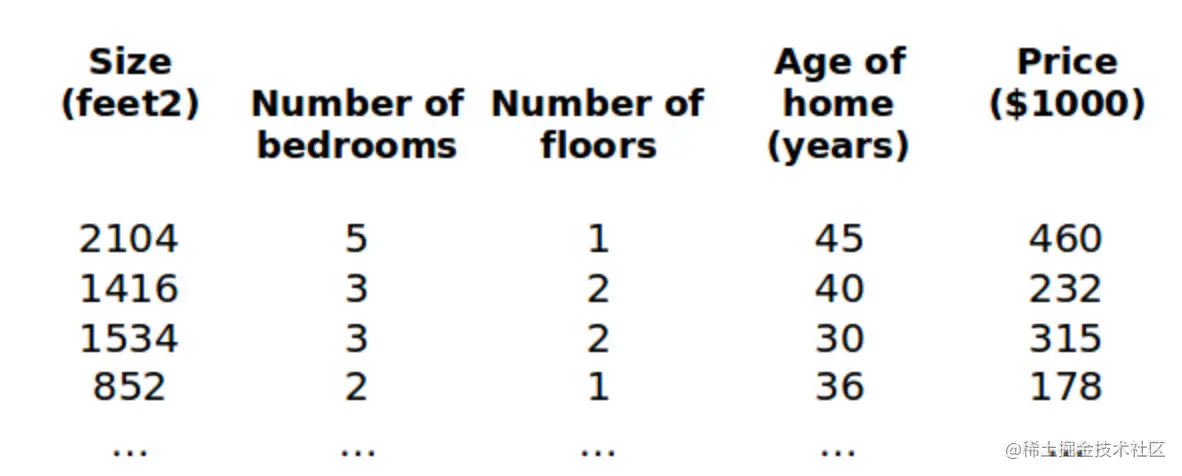 还是利用房价模型的例子,增加了更多的特征,比如:房间楼层、房间数量、地理位置等,构成了一个含有多个变量的模型
