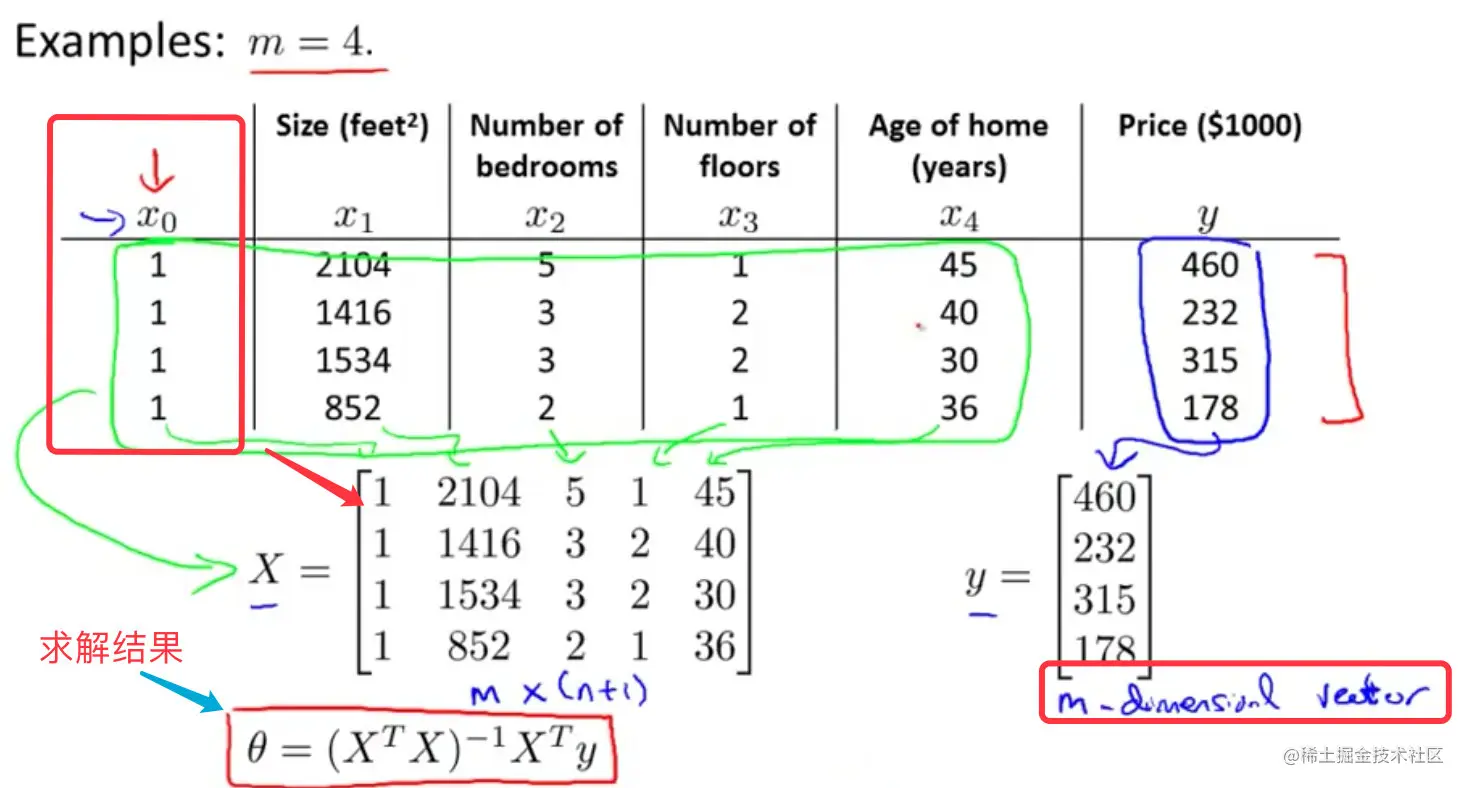 正规方程就是通过求解下面例子中的方程找出使得代价函数最小参数θ:θ=(XTX)−1XTy