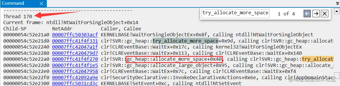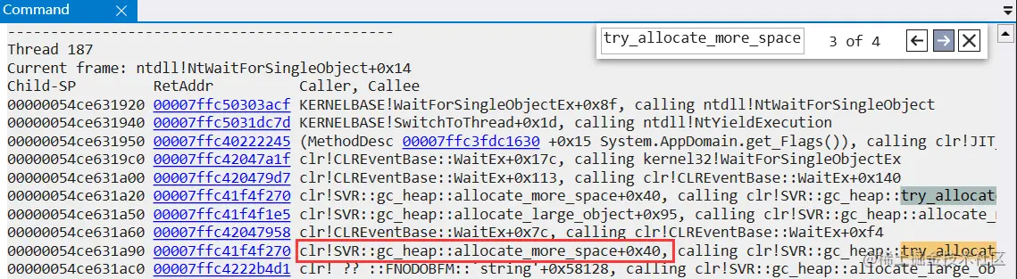 我去,可以很明显的看出当前 170 和 187 号线程正在分配大对象 gc_heap::allocate_large_object 触发了 GC,本身大对象堆是一个令人生畏的东西,对它的回收清扫都是非常耗CPU资源的,这也和朋友说到的 1分钟左右CPU就下降了 的情况比较吻合。