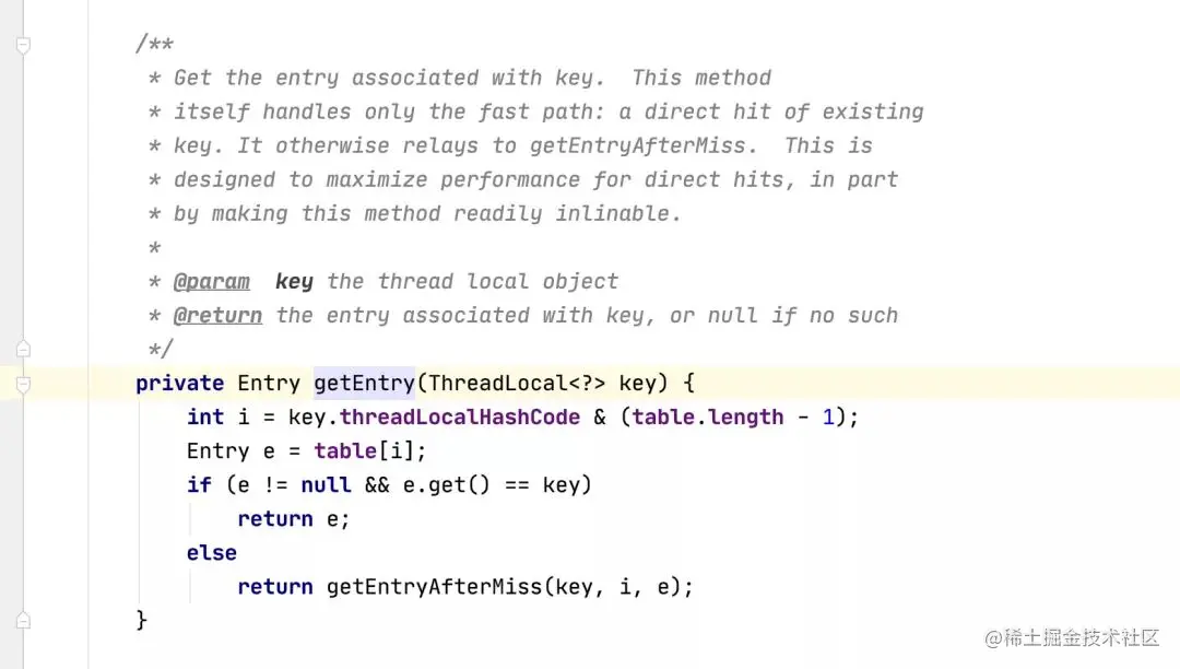 那么就来看看ThreadLocal仅有的三个public的实例成员方法,也就是get、set、remove,它们三个方法最后实际上会调用ThreadLocalMap的getEntry、set、remove这三个方法。