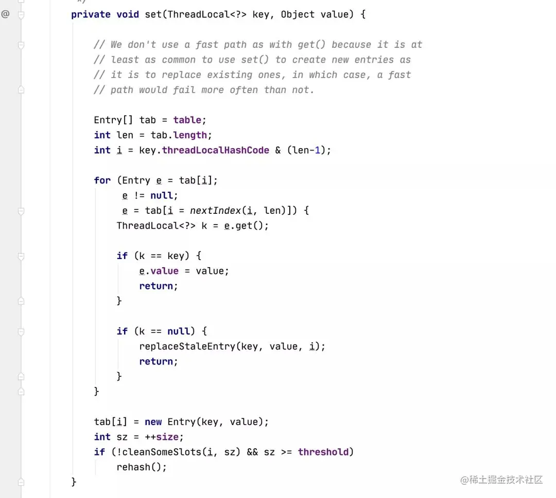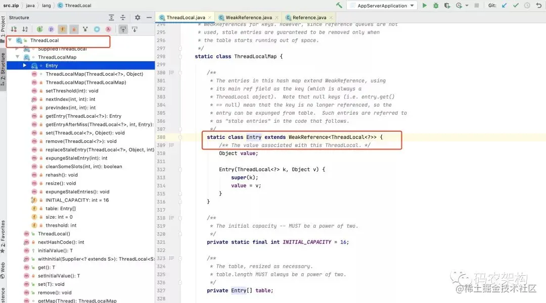 那么弱引用的作用是什么呢,只要去 ThreadLocal的源码搜一下== null就能发现它出现的每一处都是在对reference作判断,这代码里就是通过判断reference来判断Entry还有用没用的,最需要被GC的就是Entry中的value,而ThreadLocal本身是很小的,它里面只有一个threadLocalHashCode而已