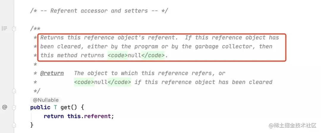 首先得看一眼WeakReference的代码,它继承自Reference,这里有个get()方法,代码如下: