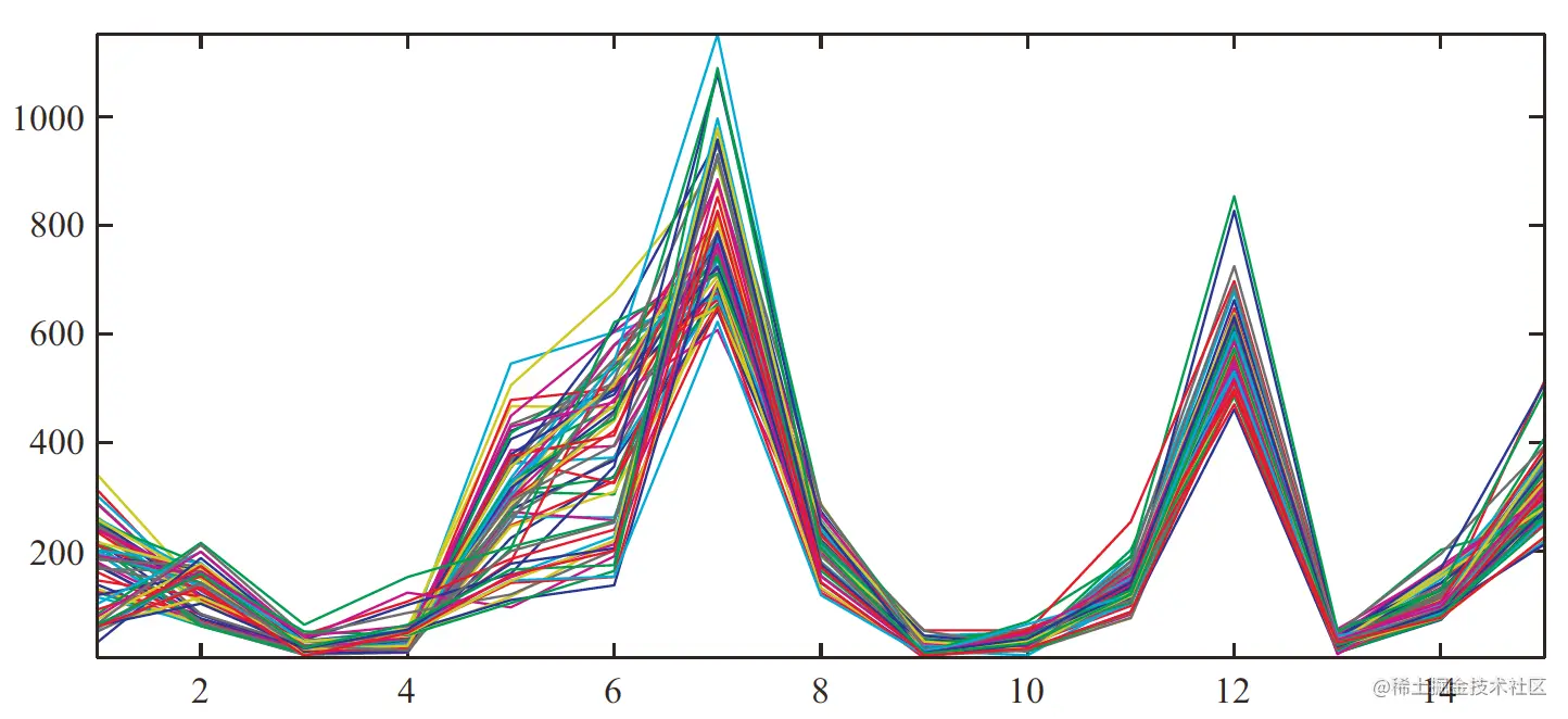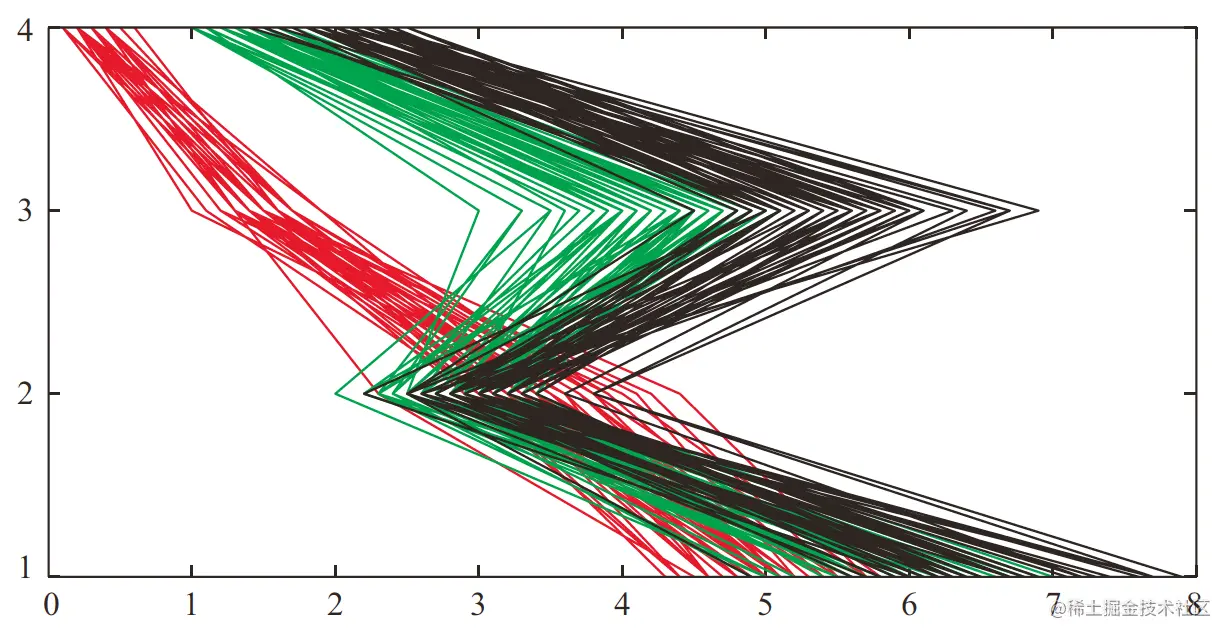Vertical parallel coordinate plots:对于一个维的样本,它的值是一个随机向量,不断在坐标系中描出点、等,一直画到,再将这些点连起来。接着,对于第二个样本,用同样的方法画在同一个坐标系中。最后效果如图: