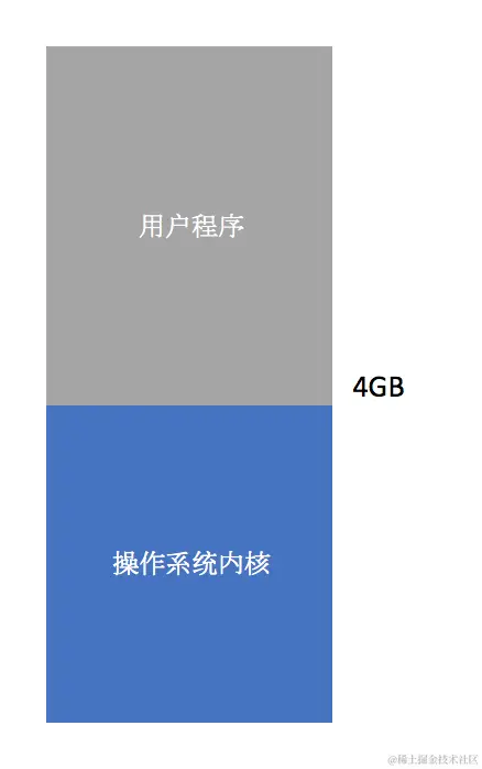 单一连续区内存分配的基本思想是一段时间内只有一个进程在内存。我们将4G的内存分为两部分,一部分存放操作系统内核,另外一部分存放用户程序,且一段时间内只有一个用户程序在内存中。如图1-1所示: