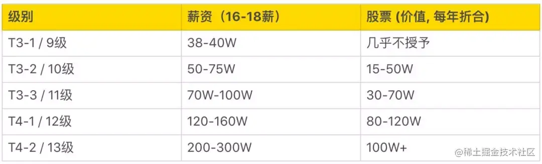 搜集了腾讯职级体系下的薪资水准和股票价值,具体参考下表: