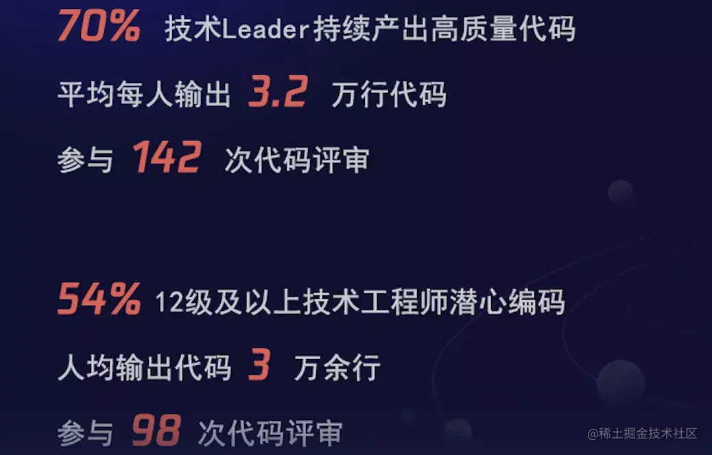 70%的技术Leader平均每人输出3.2万行高质量代码。比2019年多了0.2万行代码。
