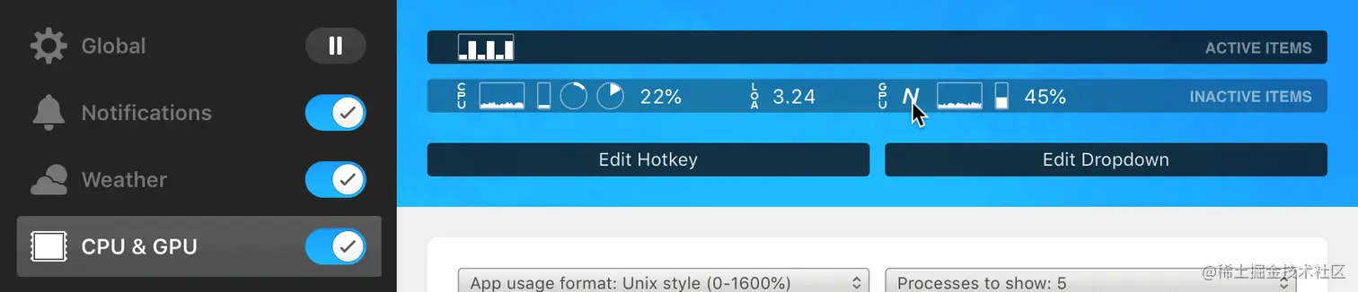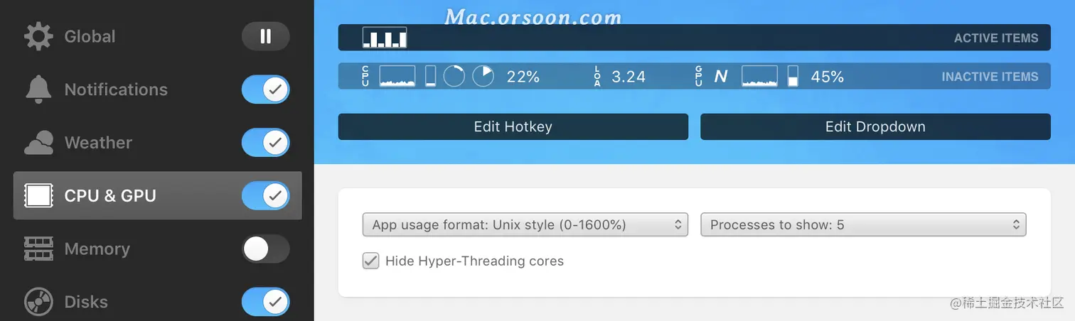 iStat菜单可以使用“ CPU和GPU”选项卡下的“隐藏超线程内核”来组合虚拟内核。