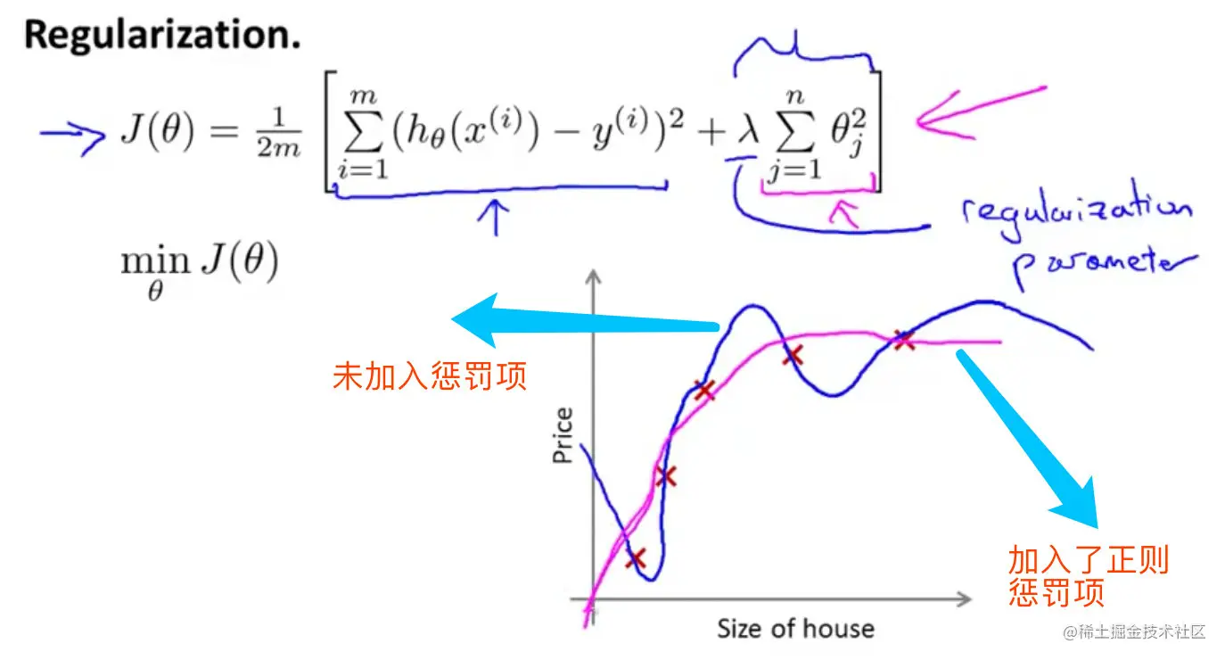 加入正则化参数后能够防止过拟合问题,其中λ是正则化参数Regularization Parameter