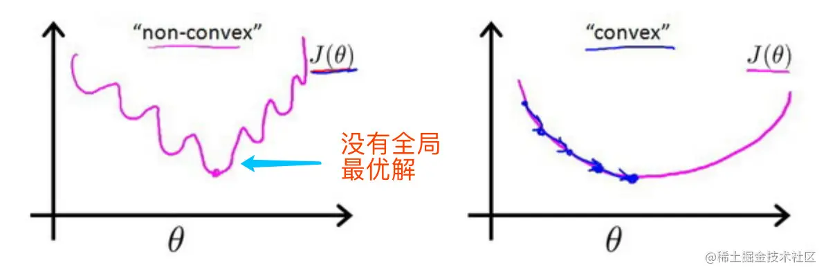 如果直接使用线性模型中的代价函数,即误差平方和,得到的代价函数是个**"非凸函数"**,但是实际上我们期望看的是凸函数(右边)