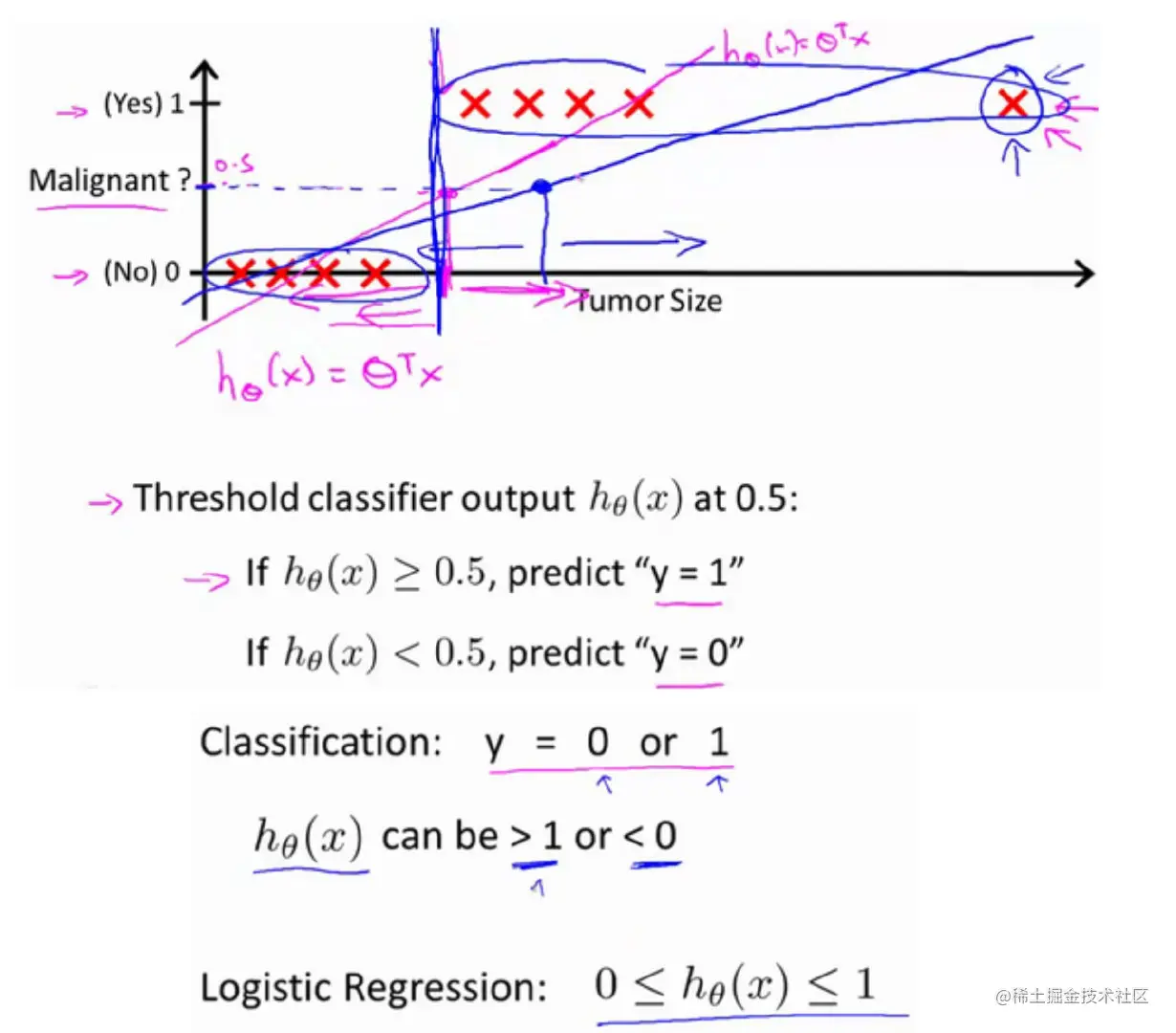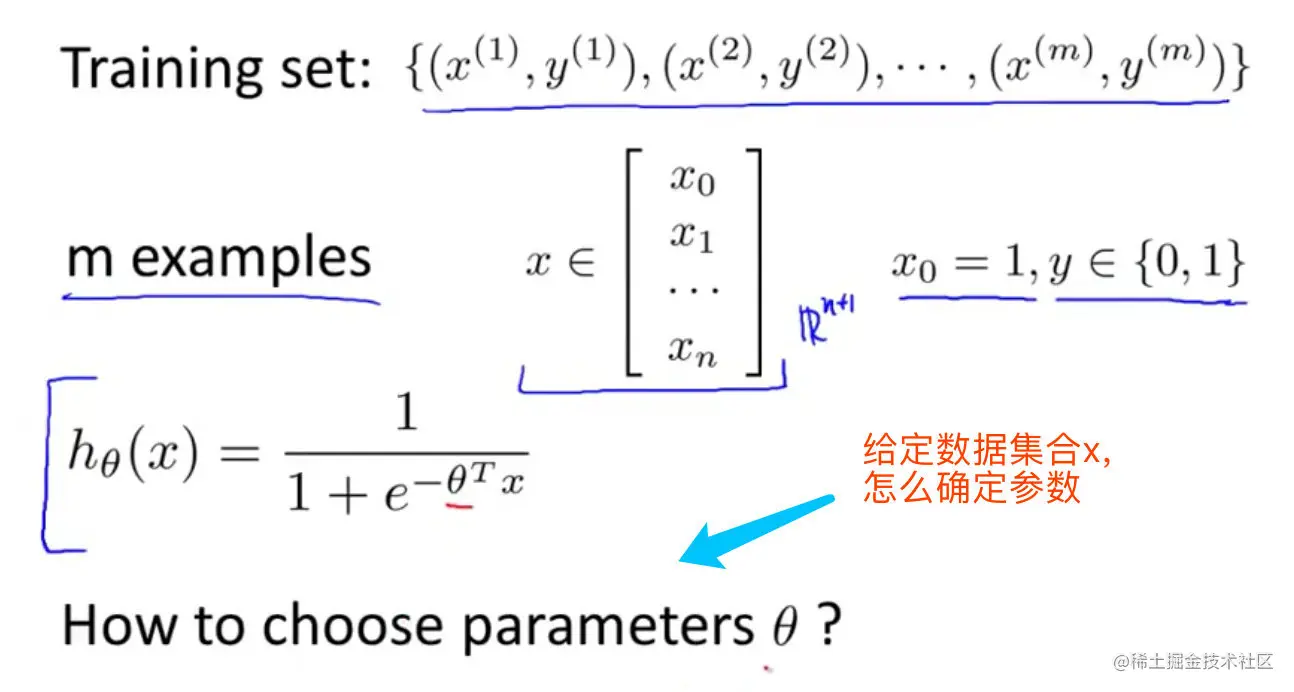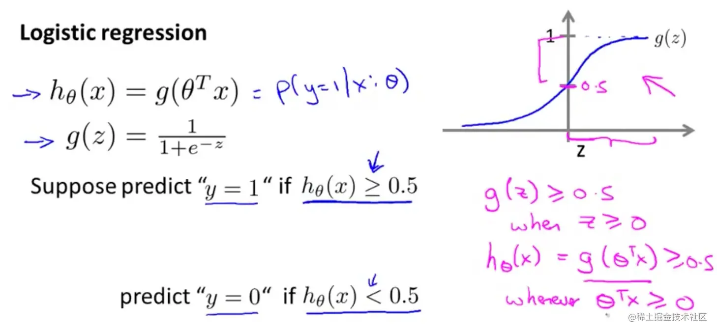 hθ(x)作用是对于给定的输入变量,根据选择的参数计算输出变量=1的可能性,即:hθ(x)=P(y=1∣x;θ)