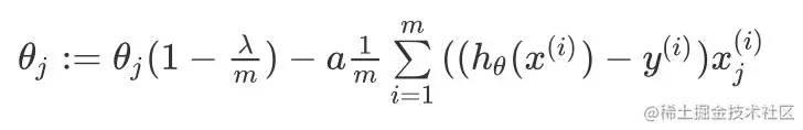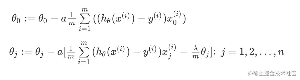 θj:=θj−a[m1i=1∑m((hθ(x(i))−y(i))xj(i)+mλθj];j=1,2,...,n