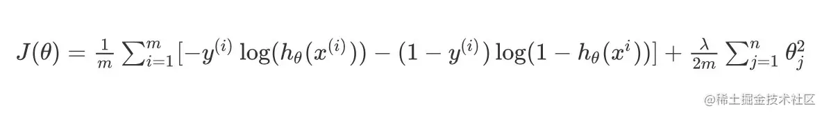 J(θ)=m1∑i=1m[−y(i)log(hθ(x(i)))−(1−y(i))log(1−hθ(xi))]+2mλ∑j=1nθj2