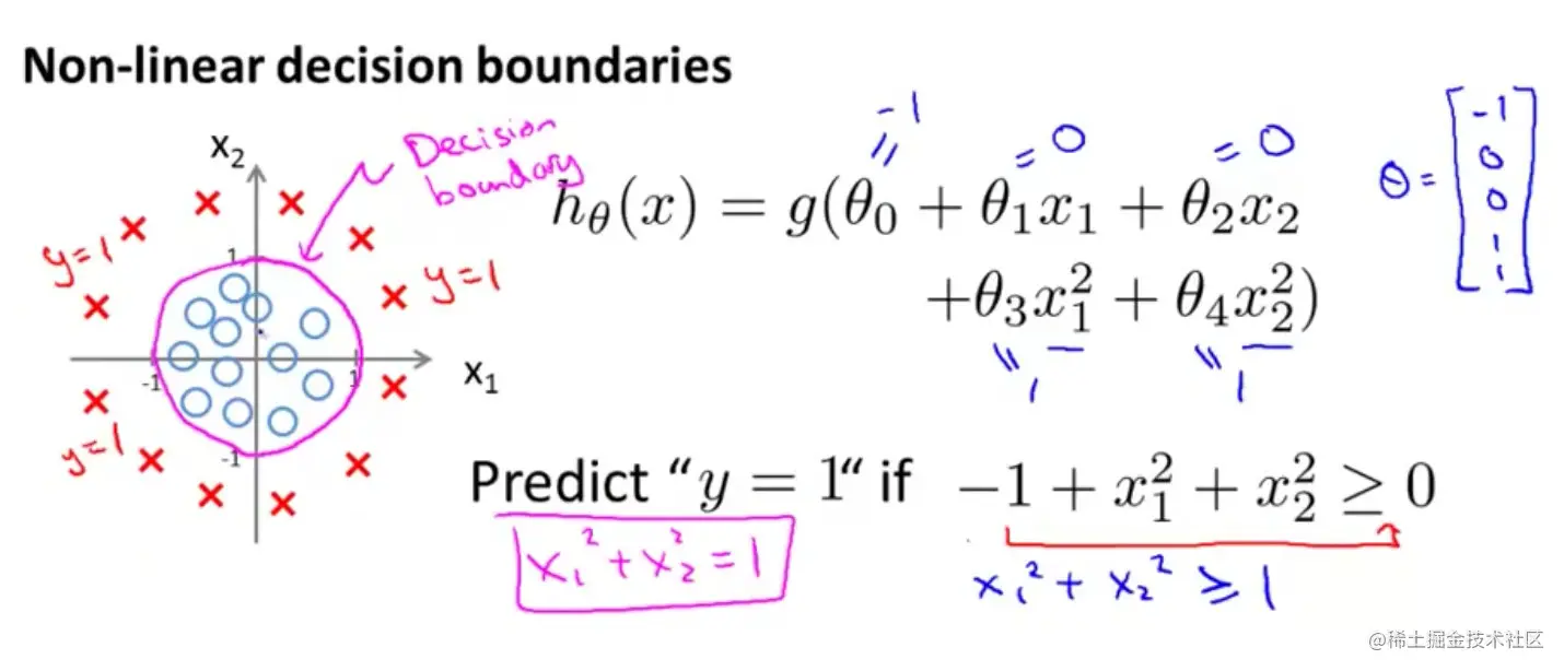 又因为 z=θTx ,即: θTx>=0 时,预测 y=1 ;反之:θTx<0 时,预测 y=0