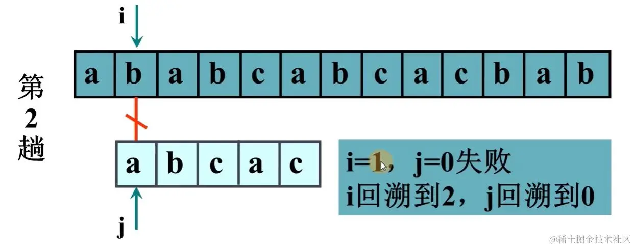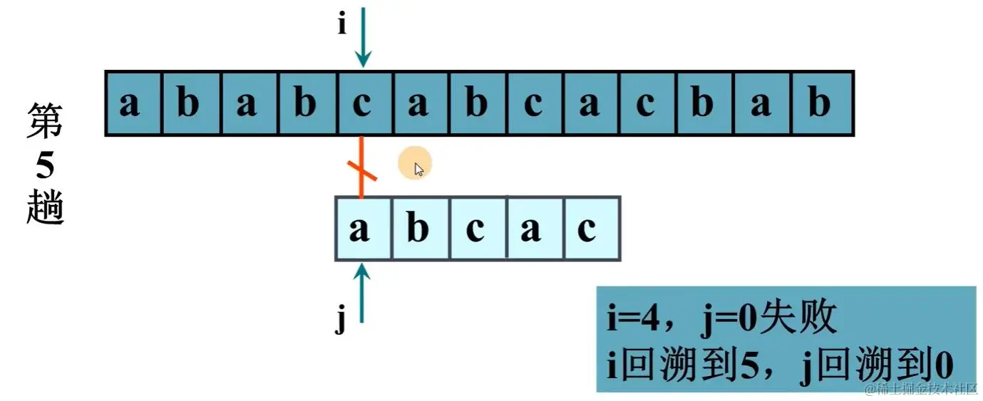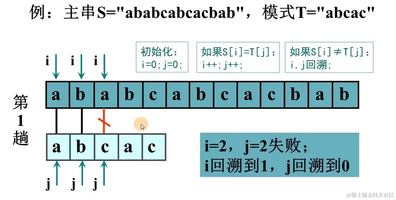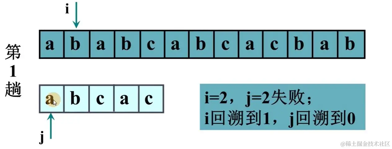 else { //一旦有不相等的,回溯。i回到起始位置加一,j回到模式串头