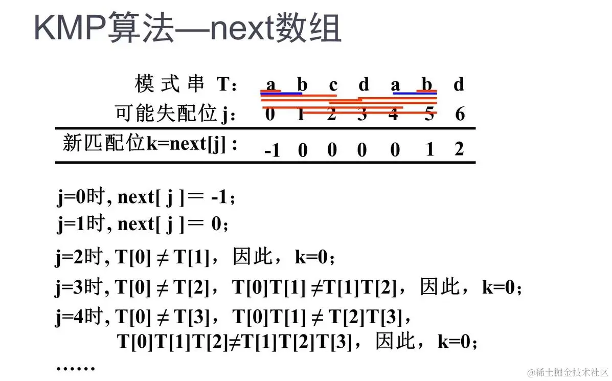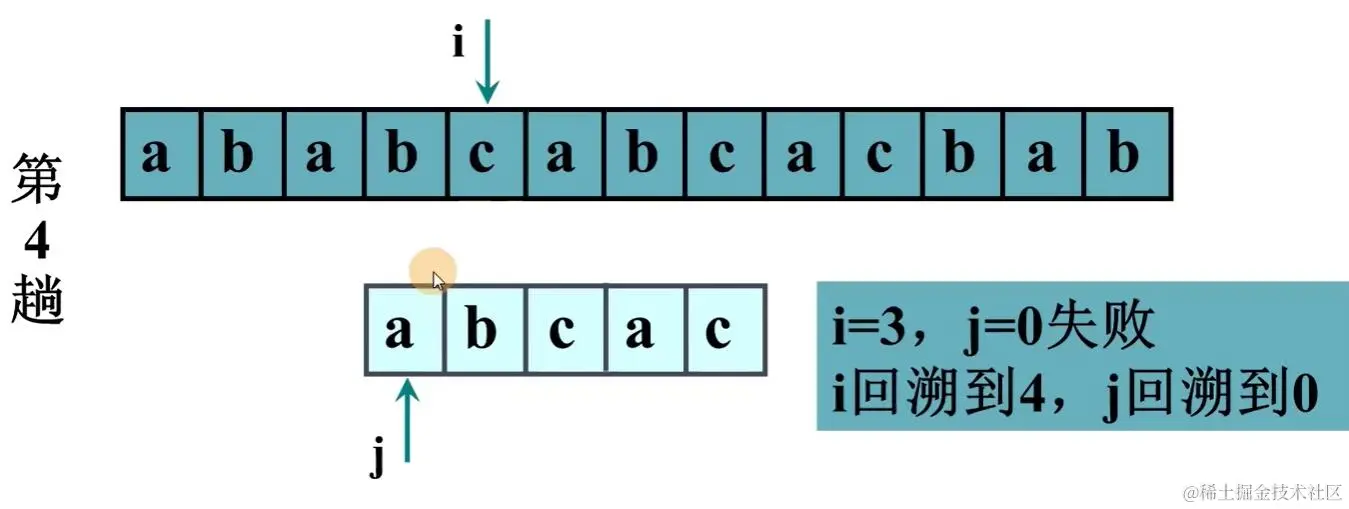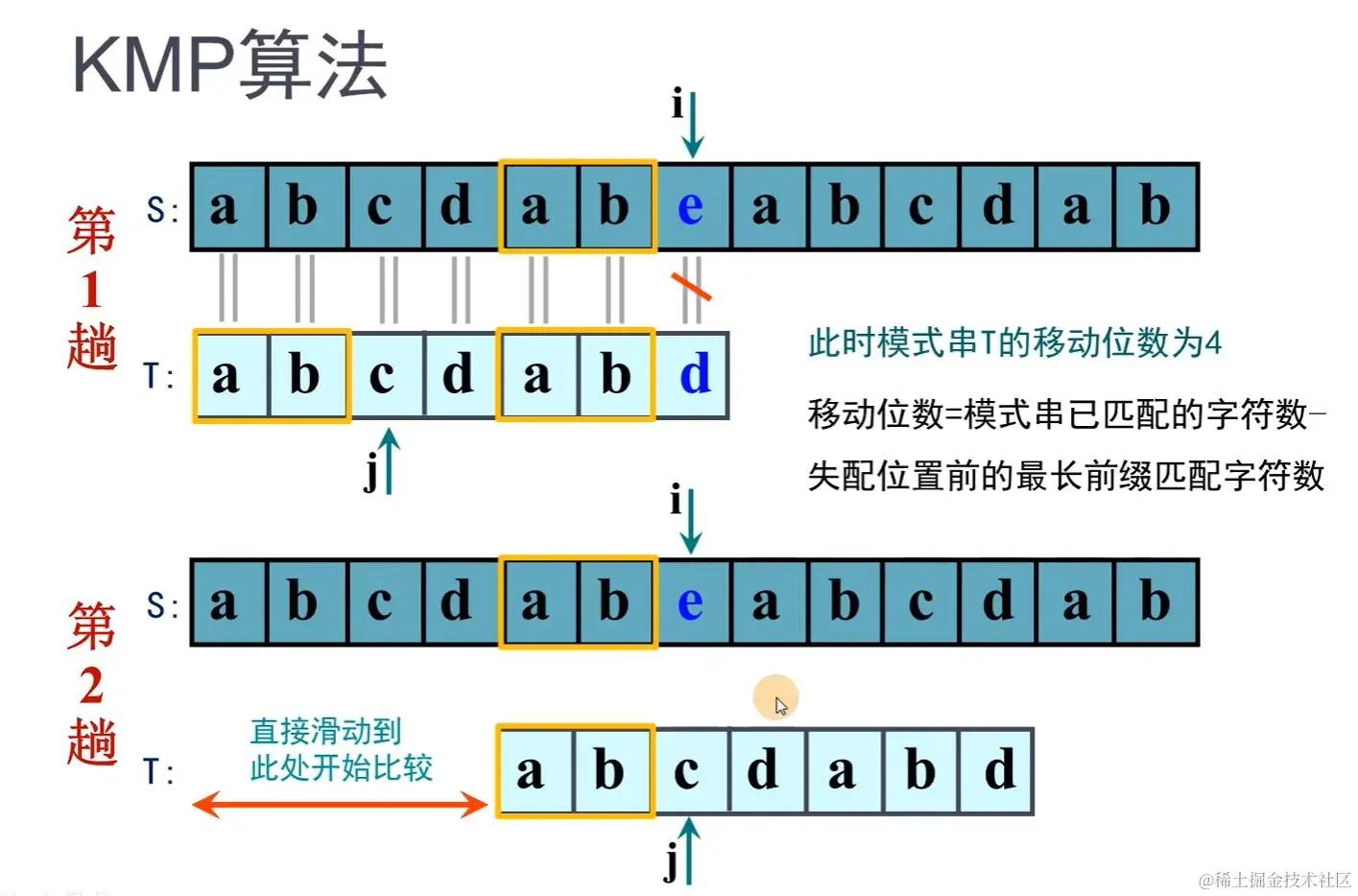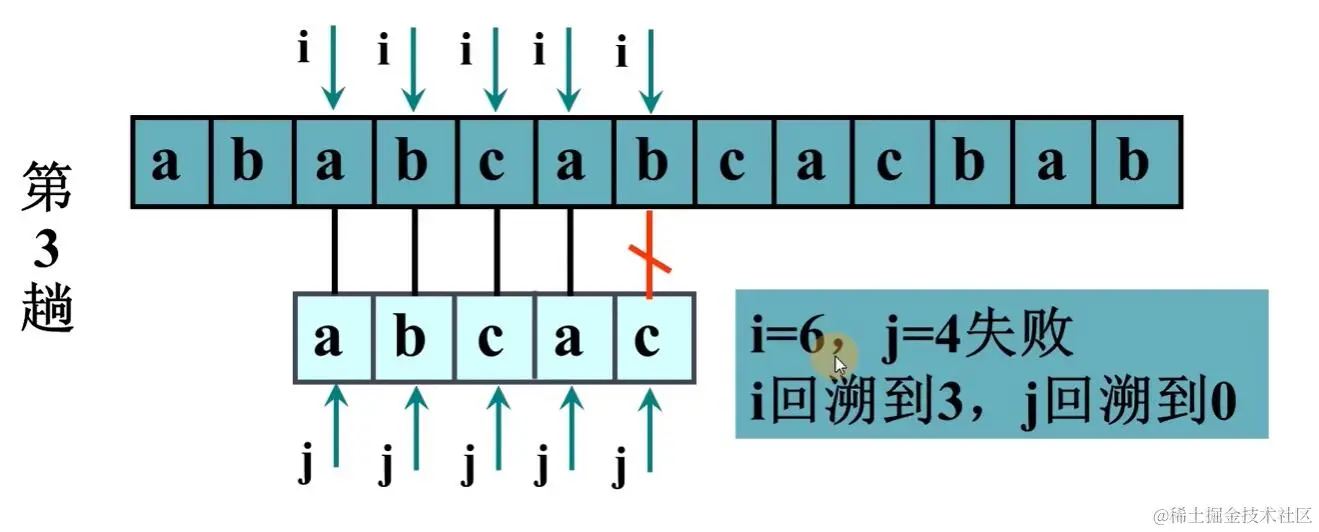 模式串中ab!=cd,故模式串中ab!=主串中cd,模式串中的前缀ab没有再与主串比较的必要,故模式串下标 j 移动到c,主串下标 i 不动