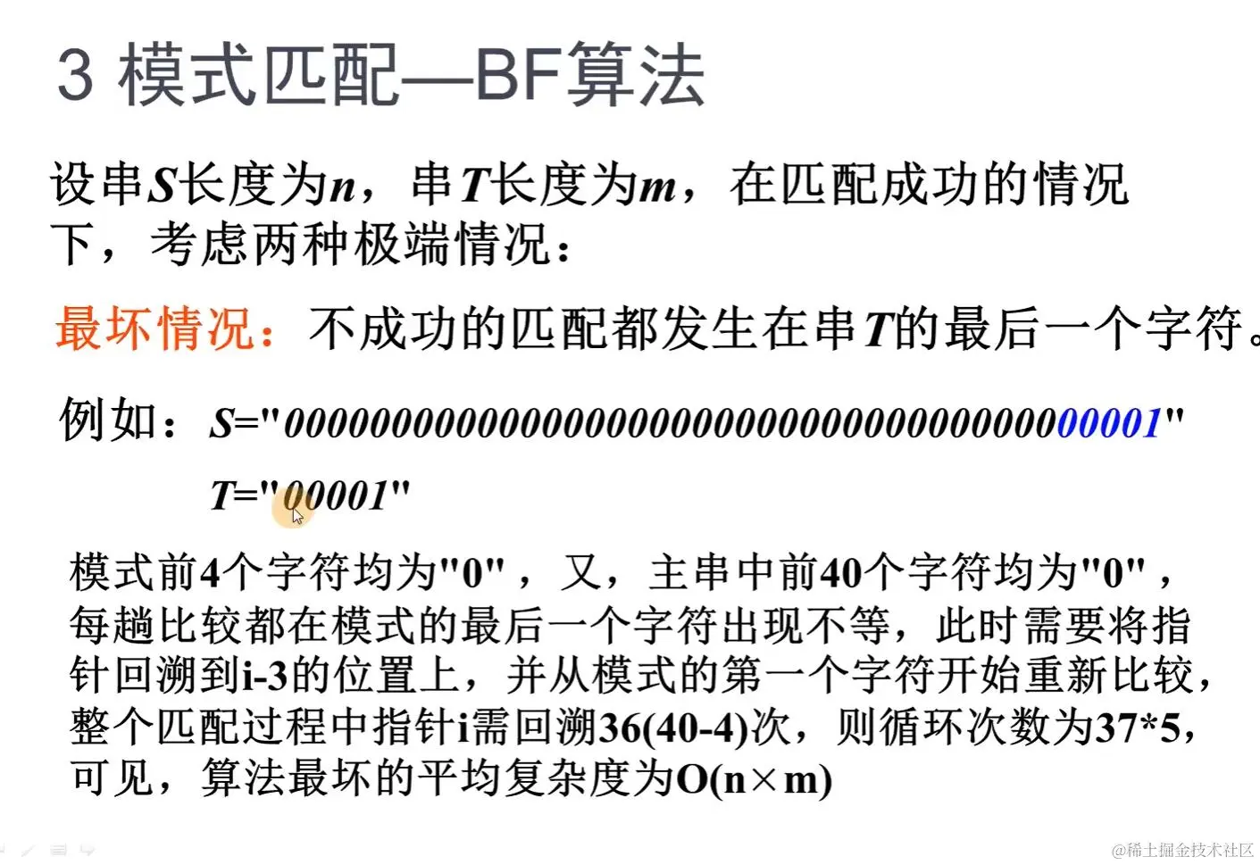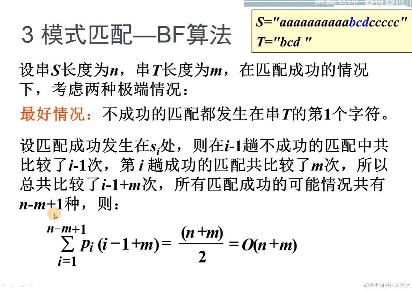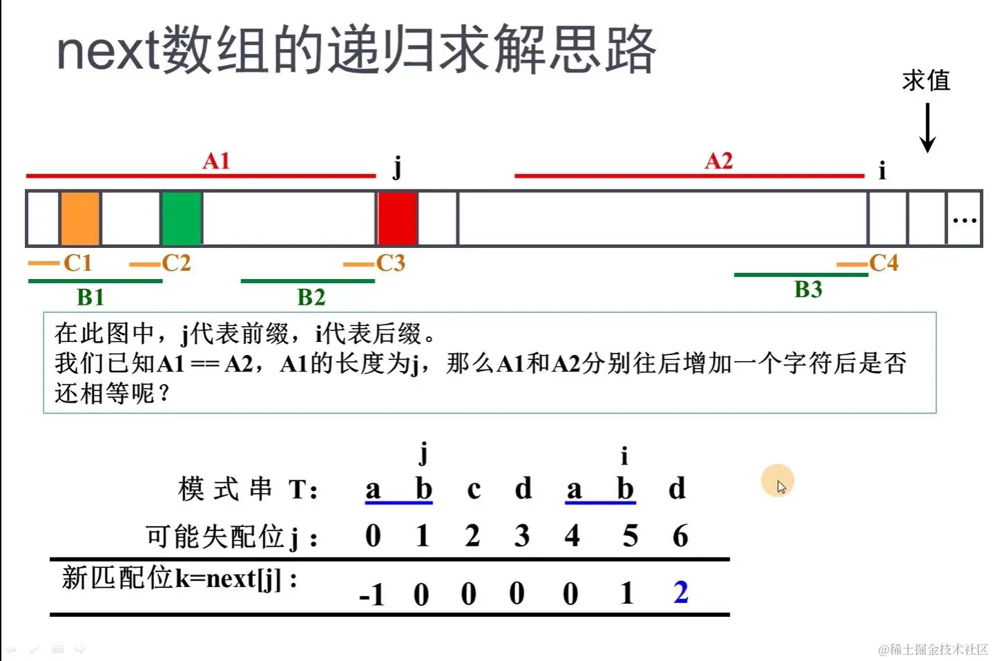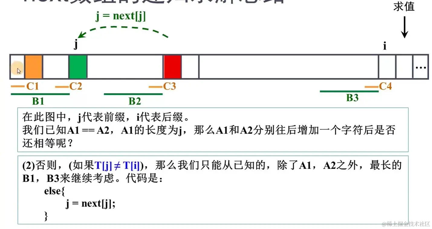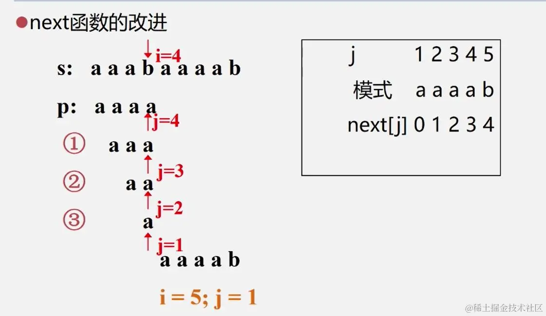 比BF算法高效,区别是主串的下标 i 不会回溯,一直前进。而模式串下标 j 回溯到特定位置。