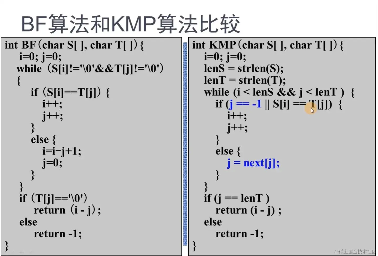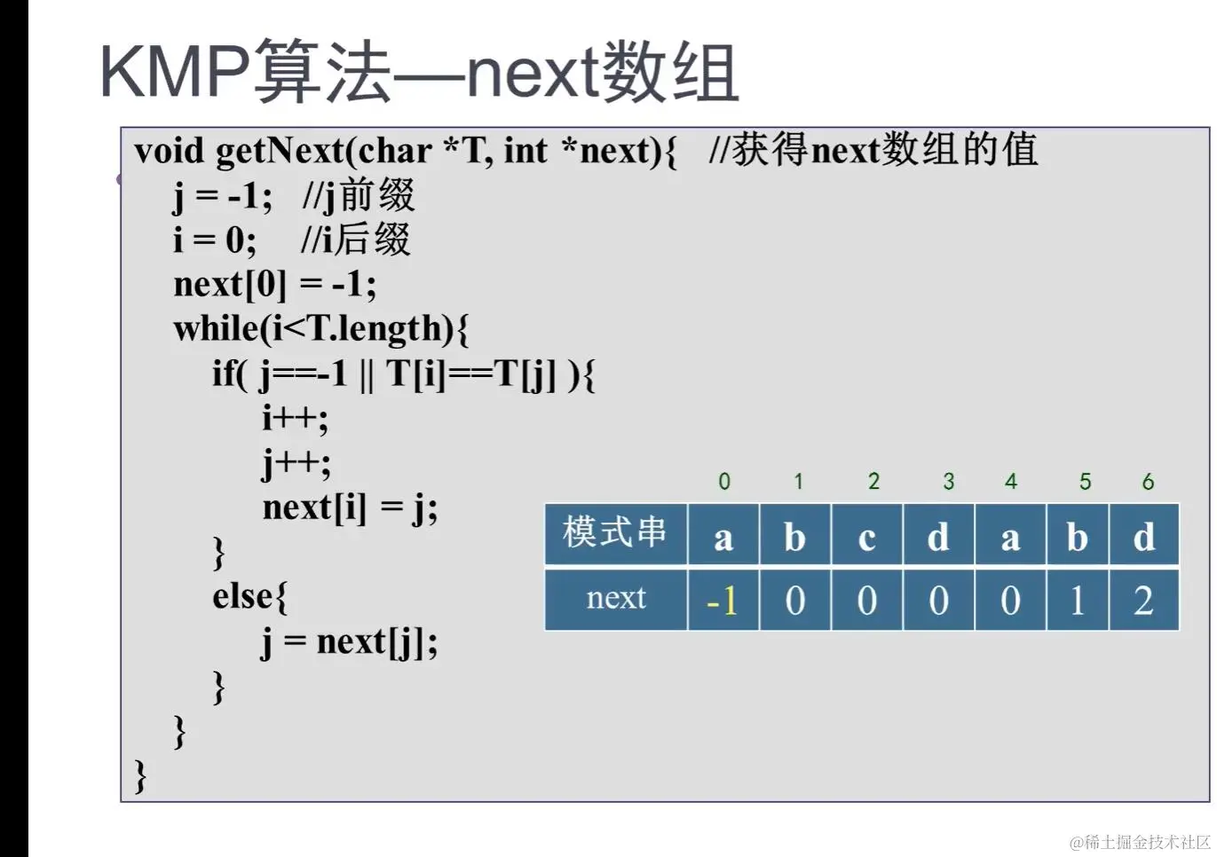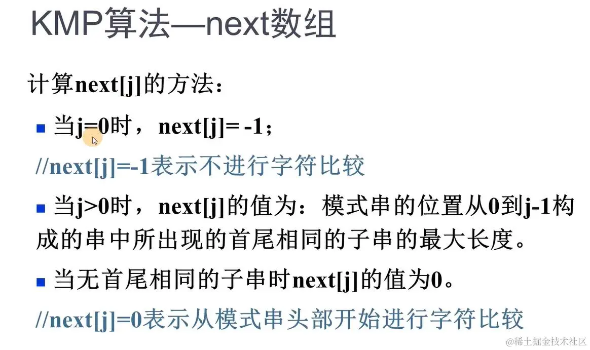 在KMP算法中 j == -1因为next数组next[0]= -1,得到 j 可能为-1