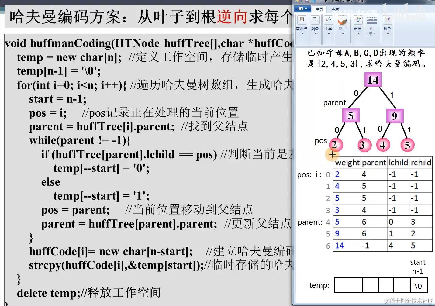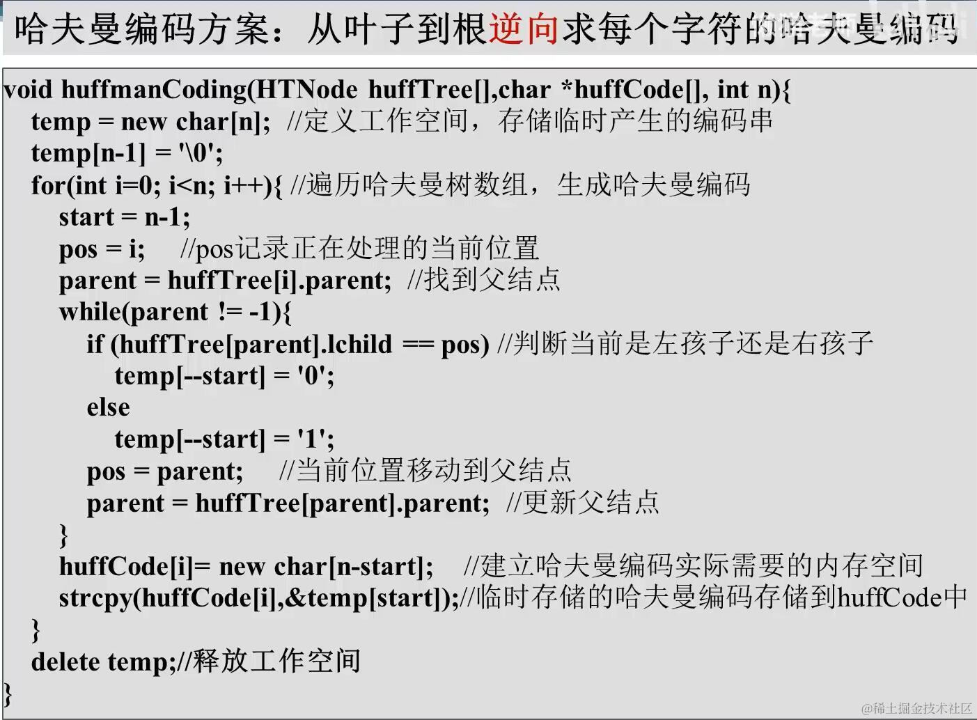 strcpy(huffCode[i],&temp[start]); //字符串拷贝,取temp[start]的地址及temp字符串首地址