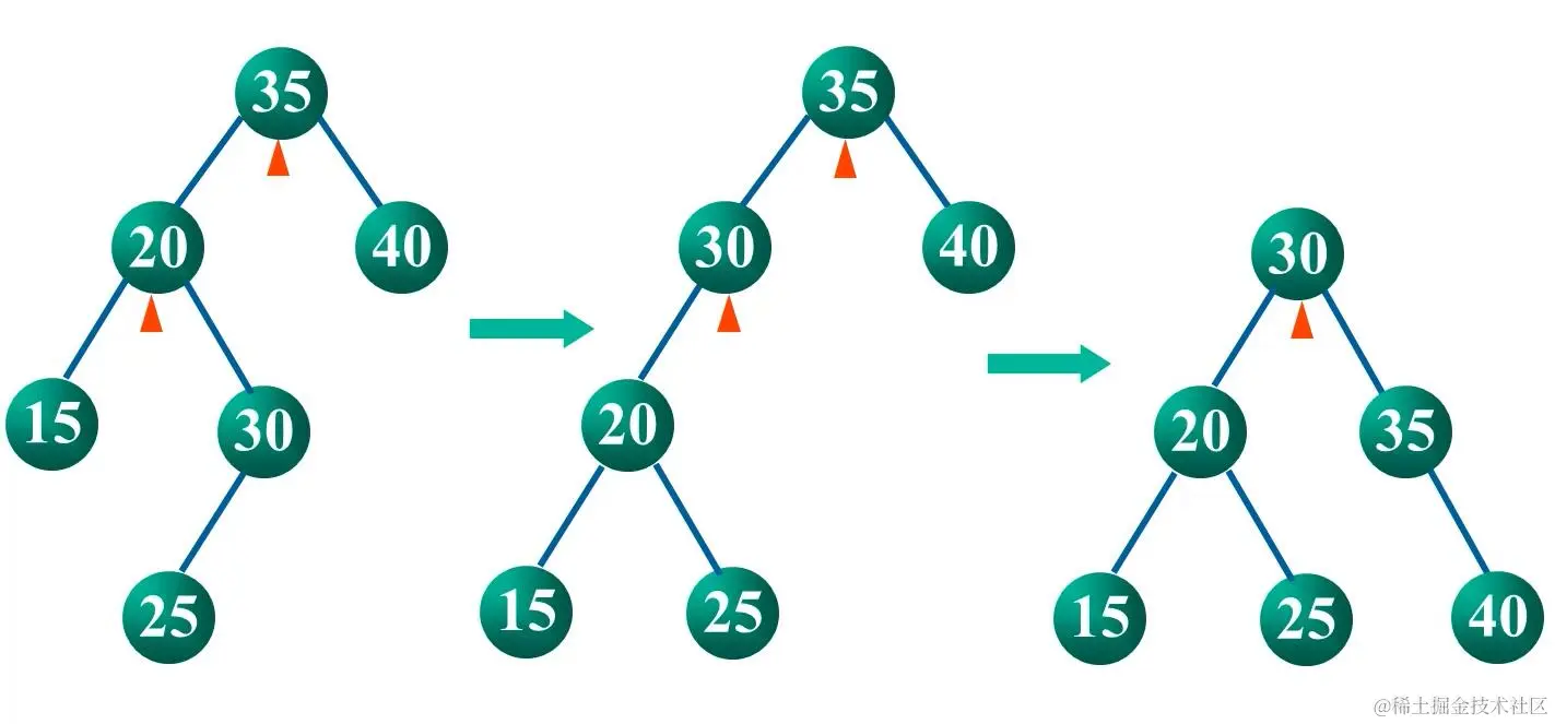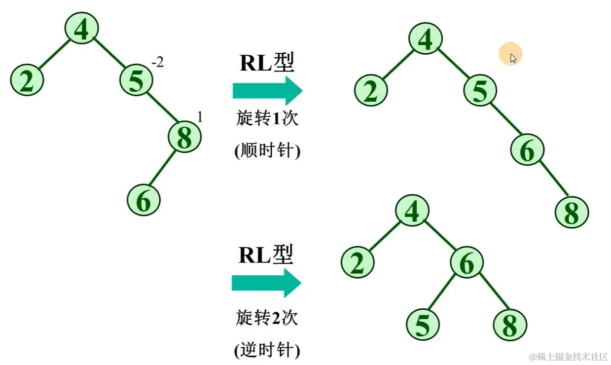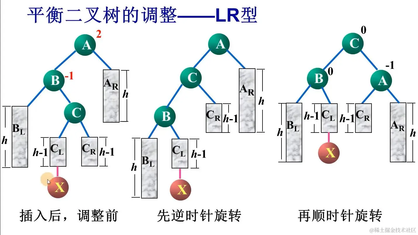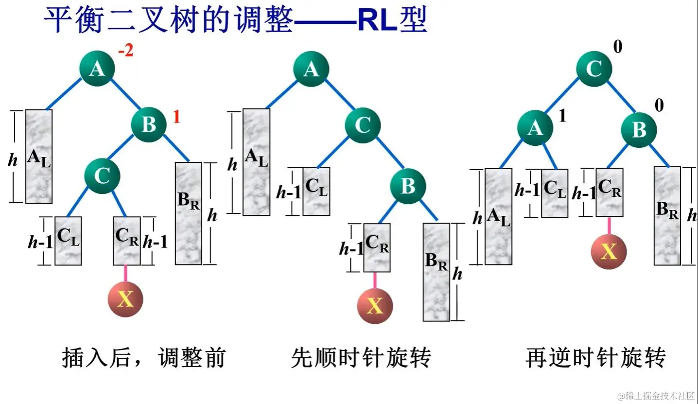 ③各子树按大小关系连接(AL和BR不变,CL和CR分别调整为A的右子树和B的左子树)。