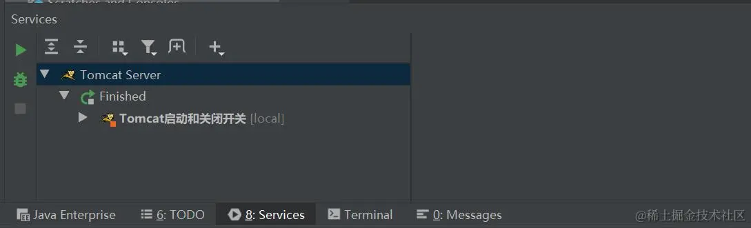 配置完成后会在低端出现Tomcat按钮,点击Run可以打开Tomcat,但是Tomcat运行时所管理的网站无法被修改。