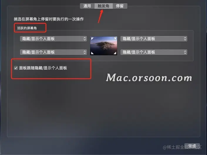 8.单击“触发角”,然后单击下拉列表以选择激活任何热角时应执行的操作。单击复选框,确定您对面板是否应该遵循“隐藏”或“显示”的偏好。