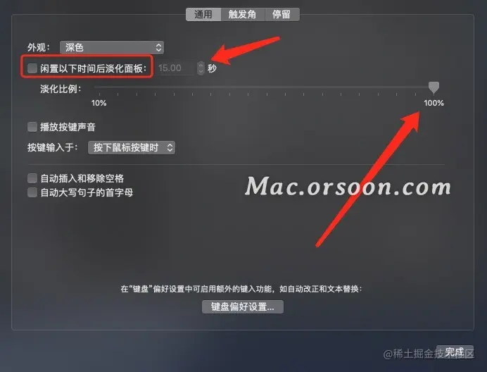 5.如果您希望在不使用键盘时使其淡出,请在不活动后单击“闲置以下时间后淡化面板”旁边的复选框。单击箭头确定在此之前应该经过的秒数以及拖动滑块以确定键盘应淡化的比例。