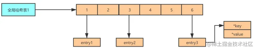 redis是由一个全局hash表存储所有键和值得关系。值存的为对象的地址。