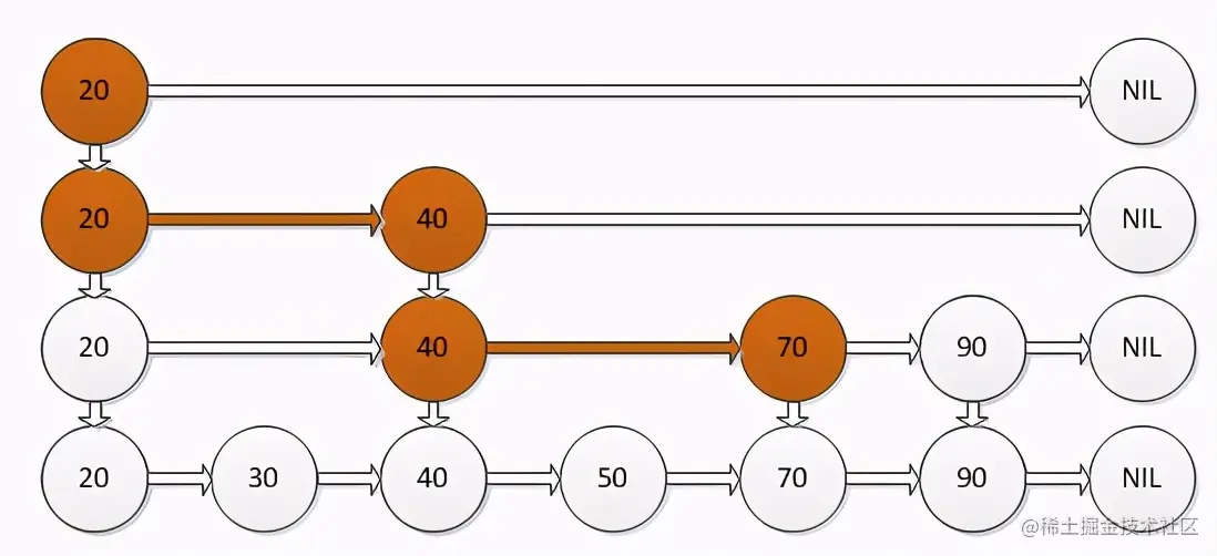 有序链表只能逐一查找元素,导致操作起来非常缓慢,于是就出现了跳表。具体来说,跳表在链表的基础上,增加了多级索引,通过索引位置的几个跳转,实现数据的快速定位。