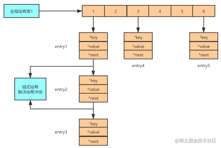 既然使用hash表,那么就肯定会有hash冲突。Redis 解决哈希冲突的方式,和JAVA中的hash表解决方式一样,也是链式哈希。链式哈希也很容易理解,就是指同一个哈希桶中的多个元素用一个链表来保存,它们之间依次用指针连接。