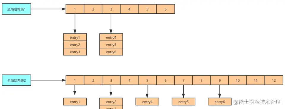 - 1、给哈希表 2 分配更大的空间,例如是当前哈希表 1 大小的两倍;