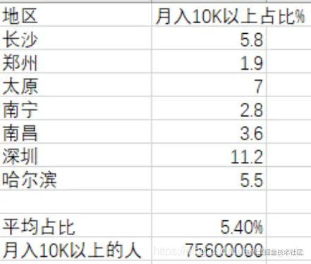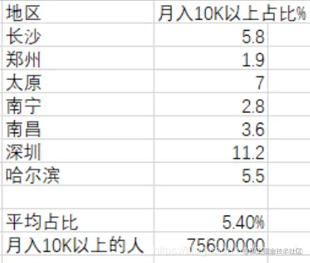 计算得到月收入10K以上的平均占比为5.4%,14亿人*5.4% = 7560万人