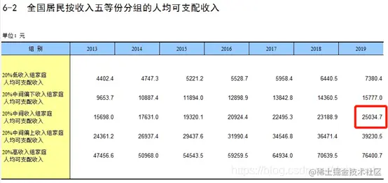 全国居民按收入五等份分组的人均可支配收入,2019年20%中间收入组家庭人均可支配收入是25034.7元/年,平均2086元/月。有40%的家庭处于低收入和中等偏下组别,年平均收入为11578元,月收入约1000元。