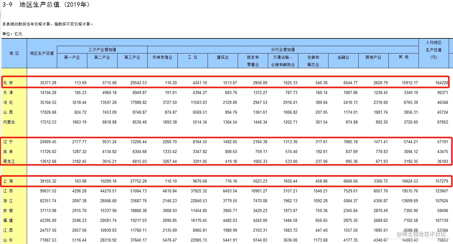 分地区来看一下,可以看到北京、上海,2019年的人均地区生产总值达到了15~16W,而东三省只有3-5W,地区差异还是很明显的。