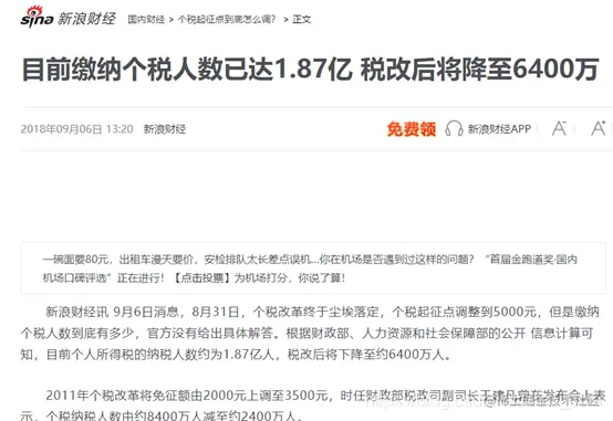 还可以从个税起征点这个角度来看,2018年以前个税起征点是3500元,此后调整至5000元,缴纳税款的人数从1.87亿下降至6400万。(最新数据有待确认)