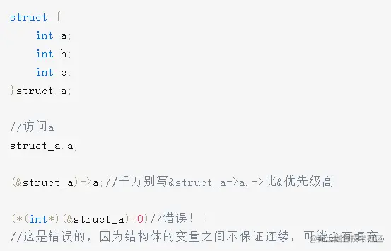 注意最后一种写法,有时候编译器为了对齐,会填充一些地址,导致不连续。不要这样访问结构体成员!