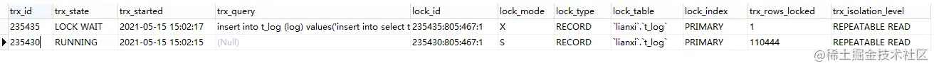 通过执行结果得知,事务id为 235430 是执行 insert into select 的事务,由于此事务中SQL已执行完毕,所以在 trx_query 字段没有展示出具体SQL语句;