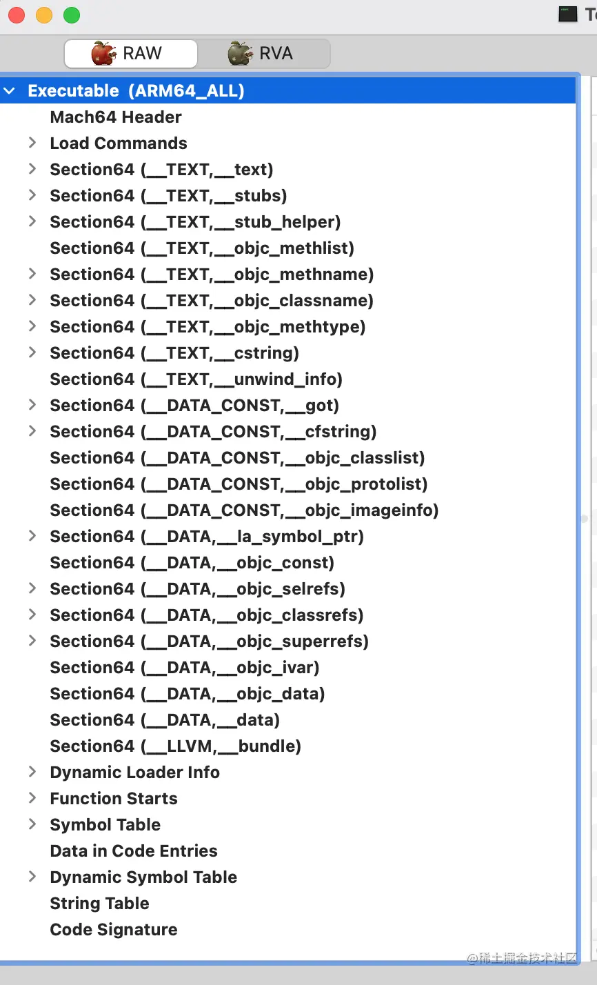能够看到Mach-O文件格式由Header、Load Commands、__TEXT代码、__DATA代码、符号表和以及一些其它信息构成。dyld会根据Load Commands保存的信息找到具体的代码